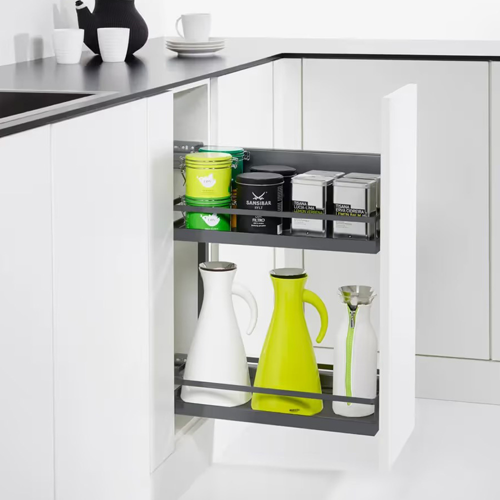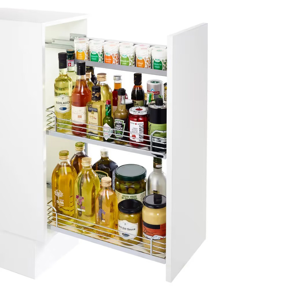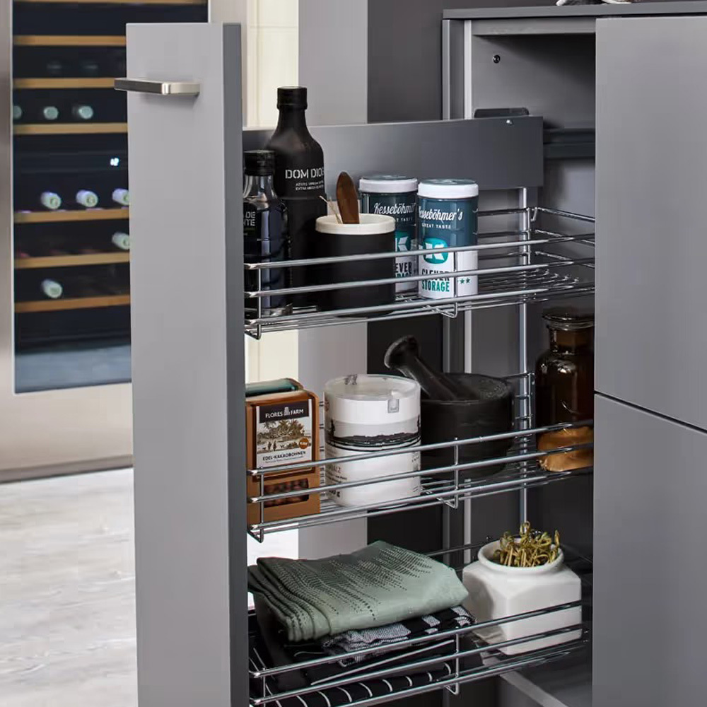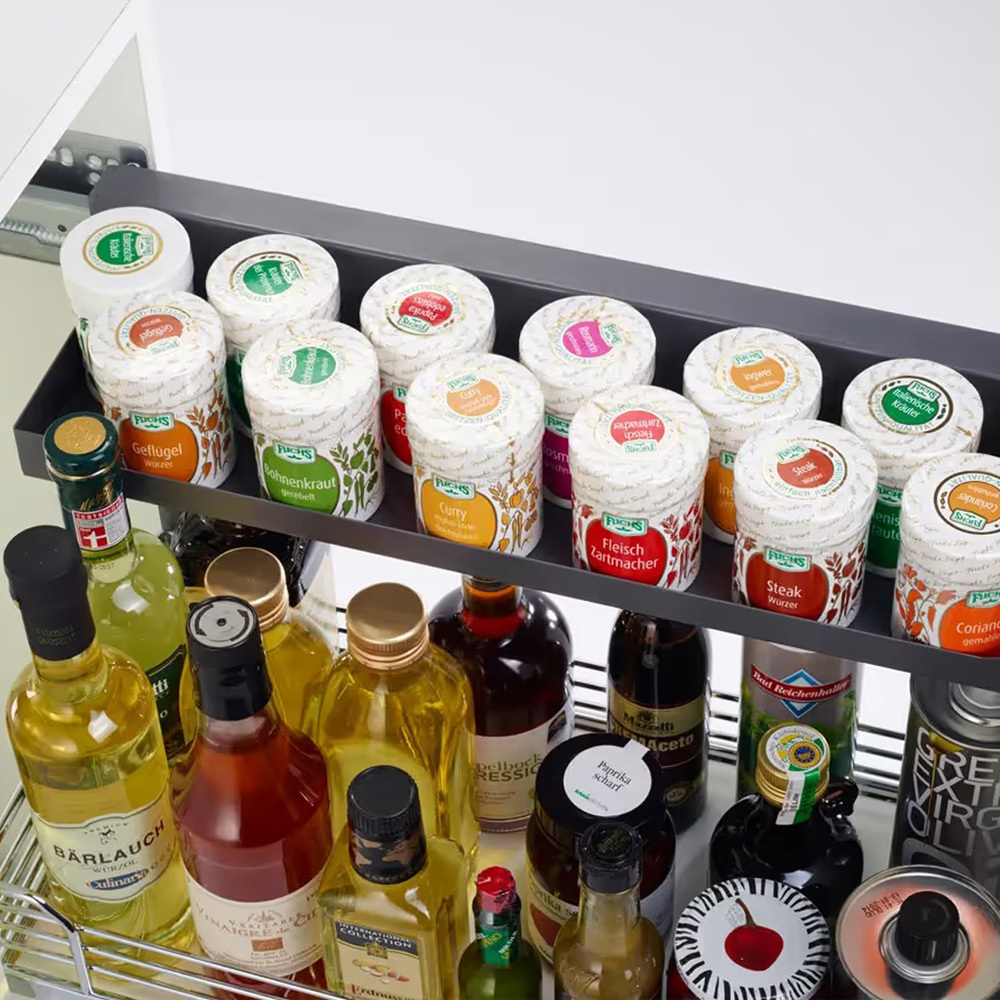 這款廚櫃拉籃除了提供順滑靜音的抽拉設計,還可額外加配調味料專用層架,靈活整合進系統,讓您的廚房收納設計更臻完美!